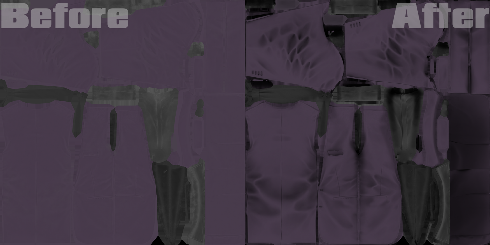 Notice how the AO helps give the texture more depth and darkens the wrinkles and areas where the suit is less commonly seen, this will help the texture looks much better when ported over to Payday 2.